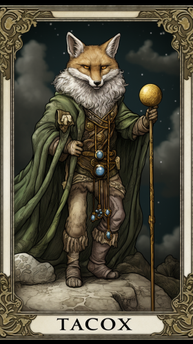 cartoon stylized tarot card, the fool, magick fox person --ar 9:16
