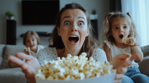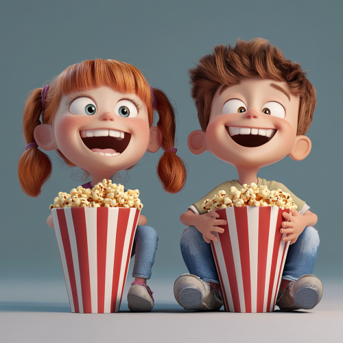 little girl and little boy, 5 years old, watching movie, eating popcorn, laughing, pixar style, animation, cartoon, 3d, cute, having fun, plain background