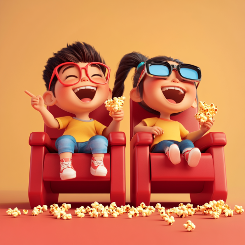 little boy and girl, age 10, dark hair and eyes, having fun,hand pointing front, laughing, happy, sitting together on a red cinema chair, side by side, eating popcorn together, wearing 3d glasses, plain background, cute, animation, cartoon, 3d, pixar style, popcorn spilling around, popcorn around