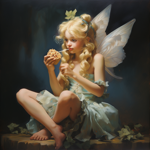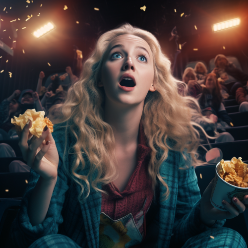 Luna Lovegood, light blonde hair, in a theater, facial expression looking enraptured, eating popcorn, harmonious compositions, motion blur panorama