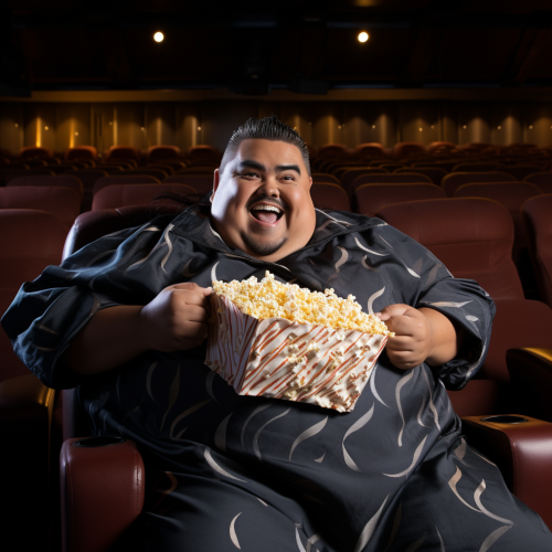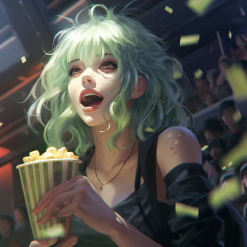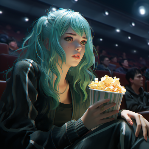 Female Byleth, light green hair, in a theater, facial expression looking enraptured, eating popcorn, harmonious compositions, motion blur panorama