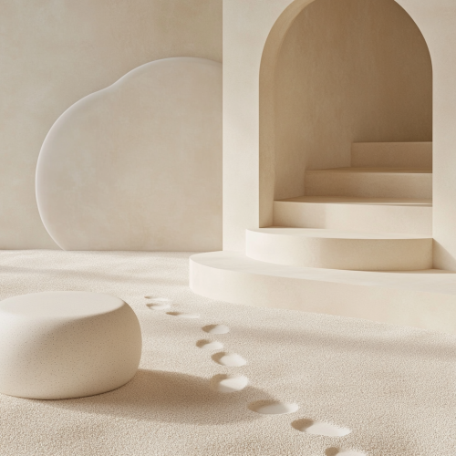A minimalist playground in soft, neutral colors with subtle footprints in the sand, representing brand interactions; a serene atmosphere with abstract shapes in the background, emphasizing perception and resonance in branding.