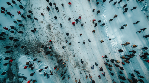A large composition mural, in a high 64K definition, cinematic, ultra-hyper-real, extreme hyper-detail, high-contrast black and white, photorealistic panoramic mid-day image. Under thr Brooklen Bridge arches, the scene features the bridges walkway covered by a pristine, smooth, untouched blanket of snow. Two abandoned suitcases are positioned about two feet apart, and directly between these suitcases are exactly two isolated, pristine footprints, perfectly centered and outlined in a subtle gold hue. There are no other footprints anywhere in the scene, and the surrounding snow remains completely undisturbed and immaculate, amplifying the mystery: How did these footprints get here, and where did they go? A brilliant, saturated gold glow leaks from the seams of the suitcases, while hot golden lava flows across the untouched snow, --ar 16:9