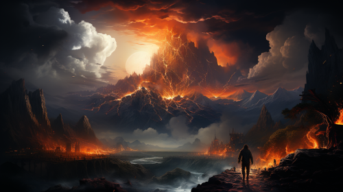 man with sward in hand, looking up long path to a mountain, there is fire on top of the mountain, --ar 16:9 --s 750