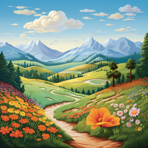 Long sream train goes through mountainous landscape,grassy hills,distant view,distant snow-capped mountain peaks,sunny day, --ar 16:9 --v 6.1 --style raw