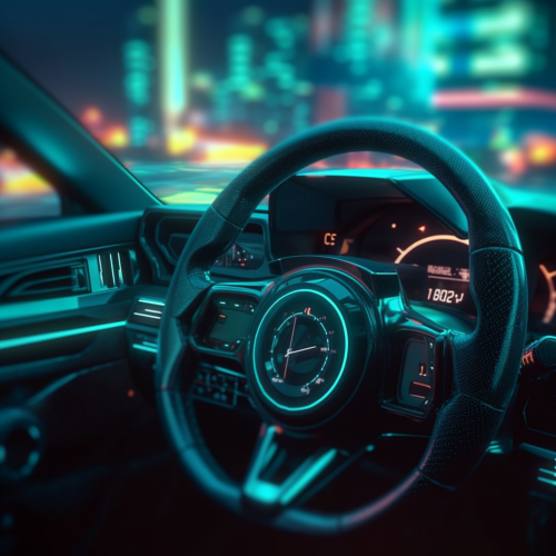 close up of steering wheel in car on cyberpunk highway, glowing teal lights, high quality photography, 8k, --ar 1:1 --s 750 --v 5.1