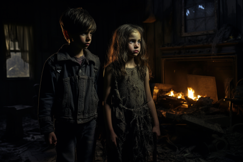 a boy and a girl inside a living room of an abandoned haunted house in the dark at night, only with the light of a lantern that they hold in their hand, realistic photography, unban exploration photography, photgraphy, dramatic lighting, volumetric lighting, extremely detailed and intricate, 8K, Full HD, --ar 3:2
