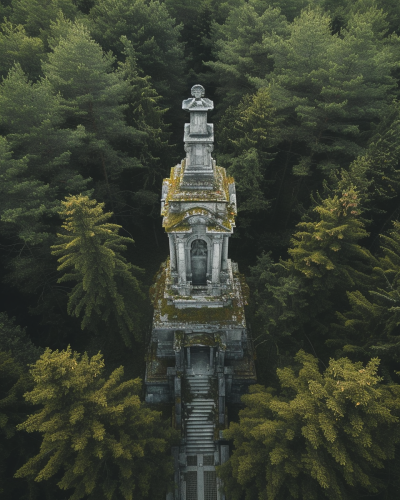 Monumental, mystical monument of ancient ruler stands in the middle of the forest, marble monument, in various places overgrown with moss, monument as tall as trees, sunny day, shot from above, professional photography, high detail, professional lighting --ar 4:5 --v 6.0