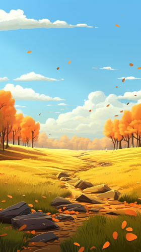 realistic cartoon animation of a field in the fall with orange leaves on the trees during a bright sunny day, cinematic lighting --ar 9:16