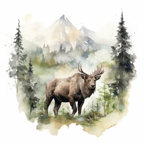 The image depicts an animal living alone in the forest, with high mountains, white background