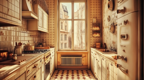 create a kitchn from 18th century, wide view window in centre kitchen assecories, brick and wooden chimney antique style, classic collage, in the style of europian houses brown theme, 4k post-processing highly detailed arch,ar 16:9 --chaos 20 --ar 16:9 --stylize 1000 --weird 900 --v 6.1