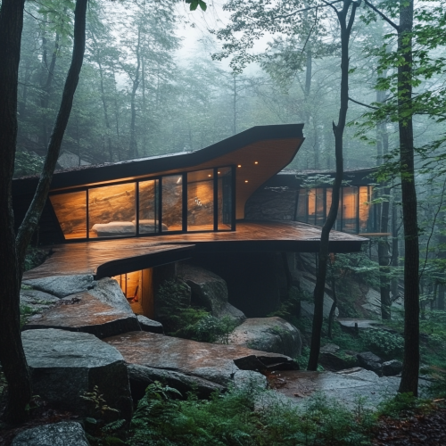 A sectional view of a modern black wood cabin in the raining forest. The cabin has a small open garden structured at center of the floor plan and separated by tall glass, each room of the floor has one sided glass panel wall from the center with bunk beds . The cabin has three floors with A shape roof with pierced peak center. The black wooden walls create a sleek exterior. Only the central glass panel offers a view of the weather conditions.