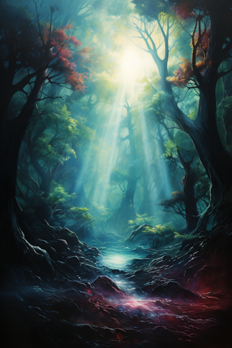 fantasy forest close-up, Sun rays shine through the treetops, retro, nightmarish, blue red green COLORS, green smoke, strange light, glow in the dark, oil painting masterpiece, adding a touch of realism and depth, --ar 2:3 --stylize 90 --v 5.2