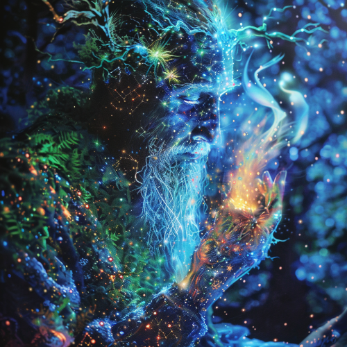 a forest spirit summoning fire, made of constellations and faceted opals, iridescent, extraterrestrial, retrofuturism, stempunk, integrated art, glowing, photopainting, deep colors, lustrous, sparking, wonder, in the liquid galaxy --v 6.0