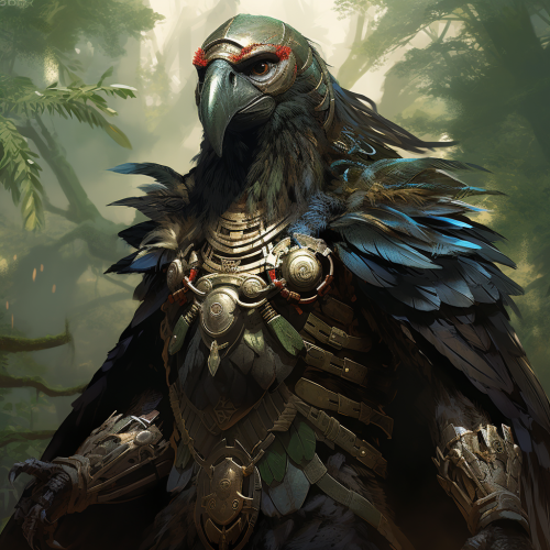 A giant avian warrior, an african eldritch jungle bird of prey god, bronze age armored, Mirskimthis the hunter, fantasy concept art, hyperrealistic african style art --v 5.2