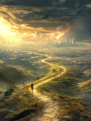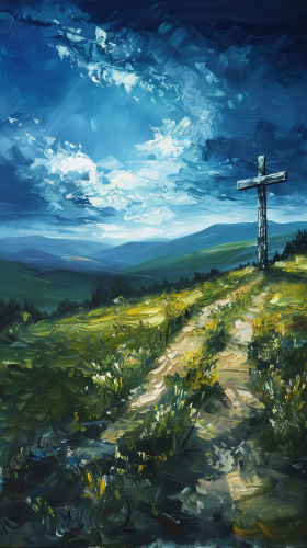 oil painting of large landscape of open valley, and a dirt road leading to a large wooden cross on a hill ultra-wide angle lens bright-dark contrast lighting blue --ar 9:16 --v 6.0 --style raw
