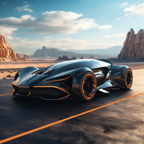futuristic car on the road, year 2147, daylight, sunny and positive vibe, future