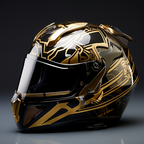 profile view of a formula one race helmet designed like a black puma head with gold teeth