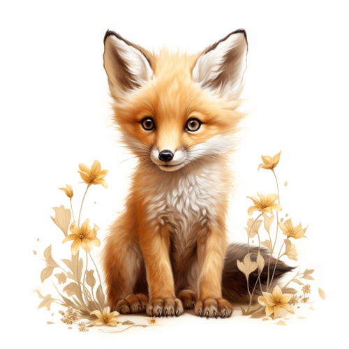 little fox on a white background art print enlarge version, looking forward, baby fox, in style of Leo Lionni, animated gifs, lighthearted, yellow and amber, elegantly formal, fairycore, depiction of animals