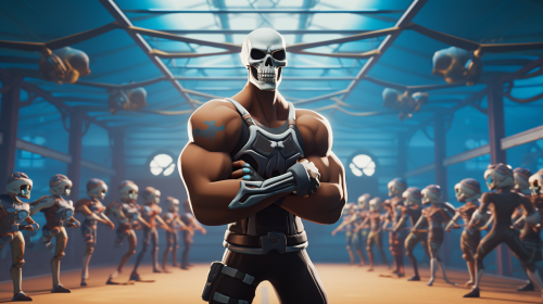 back view of fortnite skull trooper teaching gym class of young real kids, 3d render, fortnite art style, --ar 16:9