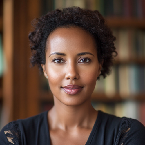 A professional portrait of Chloe Parker, a 45-year-old American writer from Virginia with Somali heritage. She has an intellectual and approachable demeanor, reflecting her deep interest in exploring modern relationships and societal norms. Chloe is dressed in sophisticated, yet casual attire suitable for a writer. Her background may hint at psychology, gender studies, or sociology. The setting is a cozy, well-lit study or library with books and notes, emphasizing her thoughtful and inclusive approach to relationships. The image should convey her passion for diversity, personal agency, and nuanced perspectives.