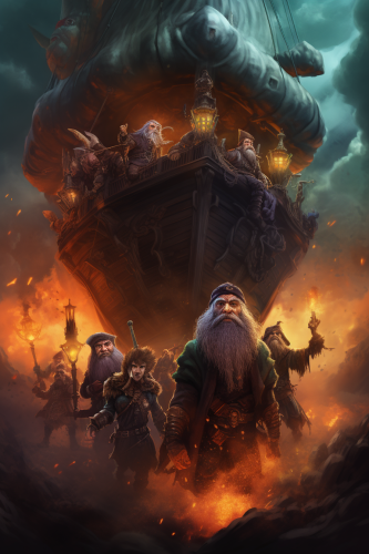 fantasy art style, realistic, dungeons and dragons, airship, flying dwarves, evil hag, graphic design, movie poster, cinematic, epic, vibrant, --ar 4:6