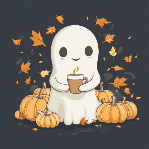 adorable little ghost with a steaming cup of coffee in his hands, colouring book style for adults, black lines, white background, side view, --v 4