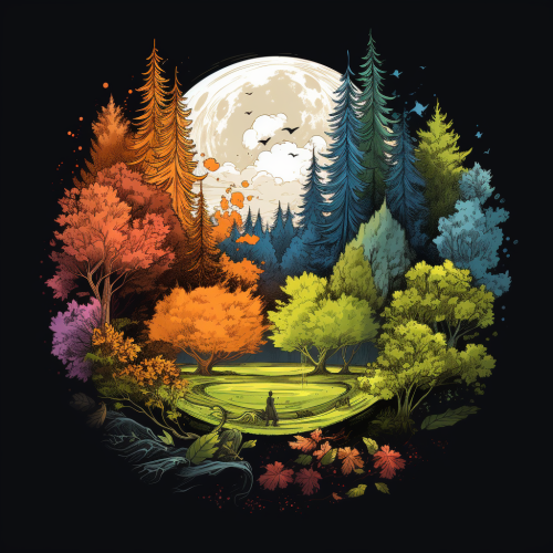 A wheel representing the changing of the seasons. The wheel has 4 sections. One has deep greens, another golden browns, another is barren and cold, and the last is vivid light green. Fantasy RPG setting. --ar 4:3 --v 6.1