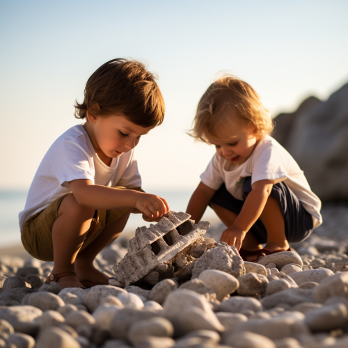 kids playing in summertime with rocks photoreal sony a6000 warm light white background