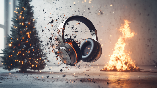 exploding headphones, shattered to pieces, floating in midair, in front of burning christmas tree in white old stylish concrete room, lifestyle photogtraphy --ar 16:9