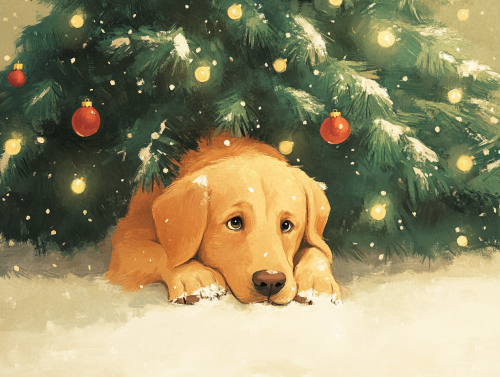 illustration of a Golden Retriever is lying at the base of the Christmas tree with a mischievous expression, and the tree is starting to tip over as if the dog has just bumped into it, drawn in the style of Oliver Jeffers, soft light, pastel colors, Christmas theme, childrens book illustation --ar 4:3 --v 6.1