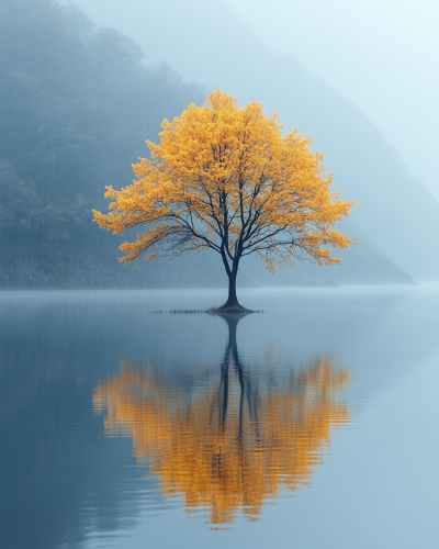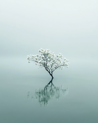 A minimalist photograph of an isolated, small tree with white flowers growing in the middle of calm water, with a pastel sky background and a reflection on the surface. High-resolution photography, high definition