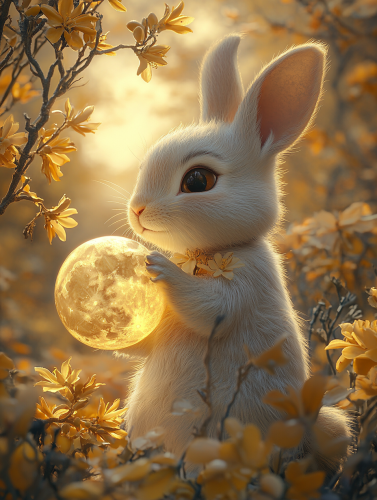 a lovely little rabbit, holding a round moon in his arms, yellow osmanthus tree ornament, clouds and flowers, soft moonlight, it has a pixar-style and disney animation-style, with a high-definition and detailed rendering effect --ar 3:4 --stylize 500 --v 6.1