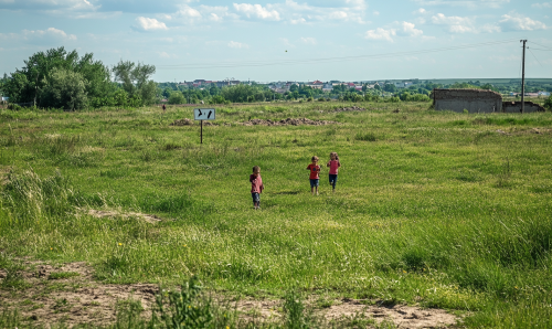 A green field in Ukraine, once dangerous due to landmines but now cleared and safe. In the background, remnants of past conflict are visible, with a warning sign on the side. In the foreground, children are playing happily, symbolizing safety and freedom. The atmosphere conveys hope, transformation, and peace, close shot --ar 5:3