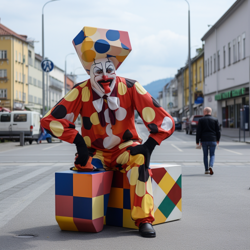 giant jester on a road with a parking ban and giant cubes