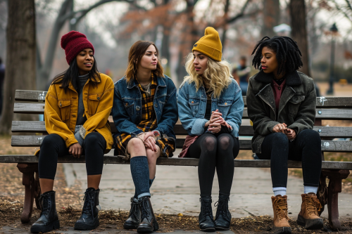 photo of four diverse young women, wearing trendy clothes, sitting on a bench in a park, winter --ar 3:2 --v 6.0 --style raw