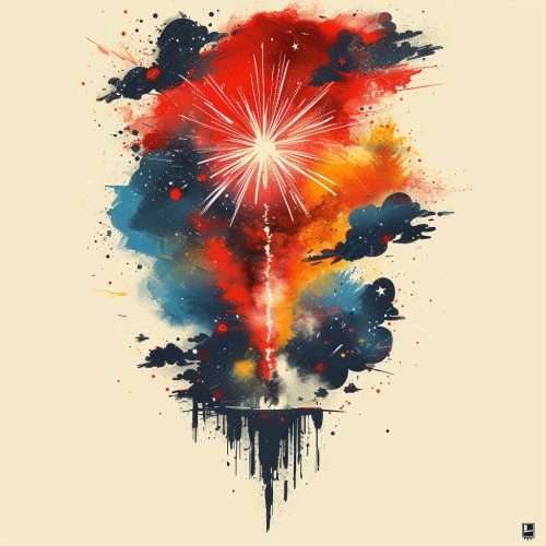 Clean paper-cut-out design in a fantasy style. gold foil accents, minimal color palette of deep-rich colors, and metallic gold, intricate linework, symmetrical and balanced composition, inspired by a magical scene of 4th of July fireworks display over Hogsmeade village, with vibrant enchanted fireworks lighting up the night sky in reds, whites, and blues, casting colorful reflections on cobblestone streets and quaint wizarding shops, Hogwarts castle faintly visible in the background under the starlit sky, wizards and witches gathered in awe, some waving small sparklers, warm glow from shop windows, festive and whimsical atmosphere, fantasy art style, rich colors