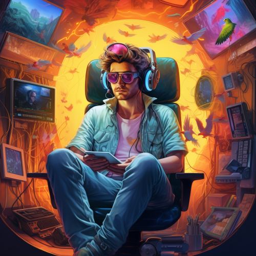 a guy sitting on his gaming chair playing his computer, 90's retrofuturism, colorful, the guy has a bird standing on his head, ultra realistic, realism