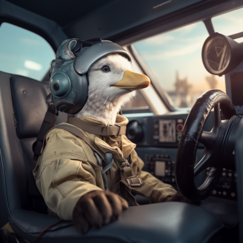 A duck dressed like a pilot sits in a cockpit with his humanoid AI assistant in the co-pilot chair. Ultra-realistic photo quality.