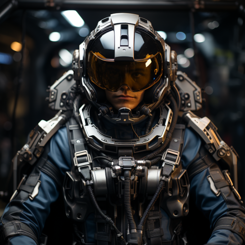 Futuristic pilot of a spaceship in a cockpit. Futuristic helmet, futuristic armor --s 750