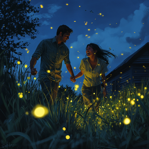 create a realistic Man and women holding hands standing in tall grass at night with fireflies flying around them. they are both happy and laughing as they are chasing the fireflies. --s 250