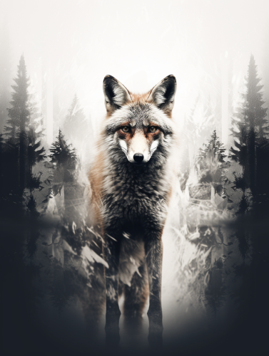 A fox in black and white with a forest in double exposure, make it realistic and artistic, dark background --ar 3:4