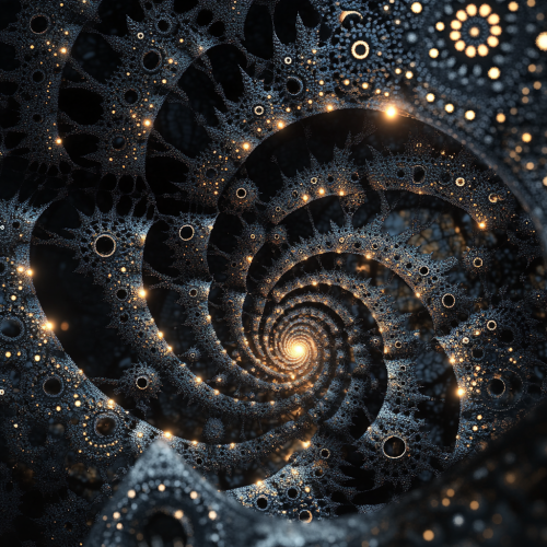 Generate a high-resolution image depicting a fractal structure inspired by the concept of 1.58 dimensions. The structure should resemble a Sierpiński triangle, showcasing self-similar, repeating triangular patterns. Visualize this fractal as a monolayer of bismuth atoms arranged on an indium antimonide substrate, highlighting the metallic sheen and atomic arrangement. The background should be dark to emphasize the intricate geometry, with subtle quantum effects like a faint glow around the edges to convey the material's unique properties