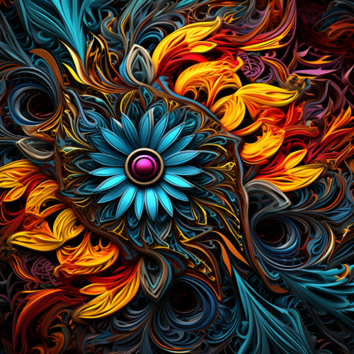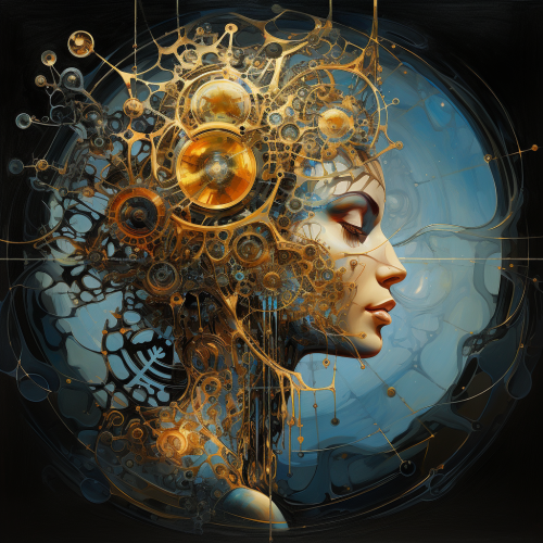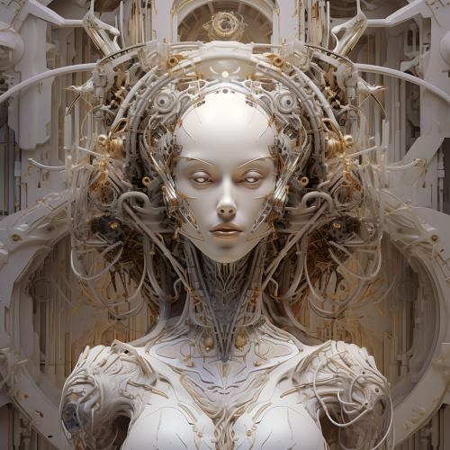 In this abstract image, a revolutionary fusion of artistic currents - baroque, romanticism, surrealism, and minimalism - harmoniously coalesce to represent a groundbreaking era where human, robot, and alien elements are interconnected. At the forefront, a celestial character takes shape, oscillating between a human-like form and an ethereal, ever-shifting state. This being is adorned with intricate, fractal-like patterns that display vibrant, ever-changing colors, symbolizing the connection between technology and the cosmic unknown. The composition is a profound moment of transcendence and unity, embodying a new art form that defies convention, where boundaries blur, and humanity embraces a future where art and technology intertwine in uncharted, mesmerizing ways.