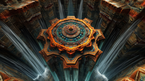 Underneath perspective of a floating 3D Kalachakra mandala Tibetan Buddhist temple, octahedron shape, fractal symmetry, in mystical space. Waterfalls flowing to center, Tibetan dragon above. Temple in ochre, red and blue pinstriping. Created Using: unique under angle, cosmic space theme, fractal architecture, Tibetan dragon art, dynamic water mechanics, hd quality, natural look --ar 16:9 --v 6.0