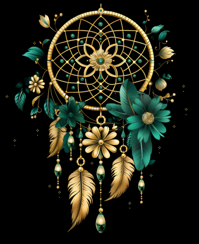abstract art,graphic design,gold flower two gold dream catcher, Indian amulet, circle with feathers and beads attached lights, mandala nside the body, for adults,dark green background, --ar 9:11