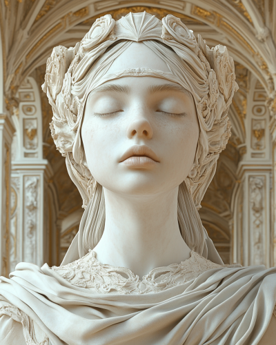 beautiful woman with grey white skin and pupilless eyes, in elaborate fine robes; style blend of ancient rome and renaissance italy; fantasy art fine details, hyper maximalist, 3D rendering, C4D, depth of field, high-definition photography, natural lighting, full HD 8K --ar 4:5 --stylize 750 --v 6.1 --chaos 7 --weird 2