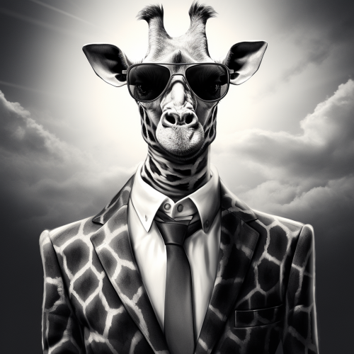 giraffe dressed in a suit, charismatic looks, with sunglasses, black and white picture, realistic, sympathetic
