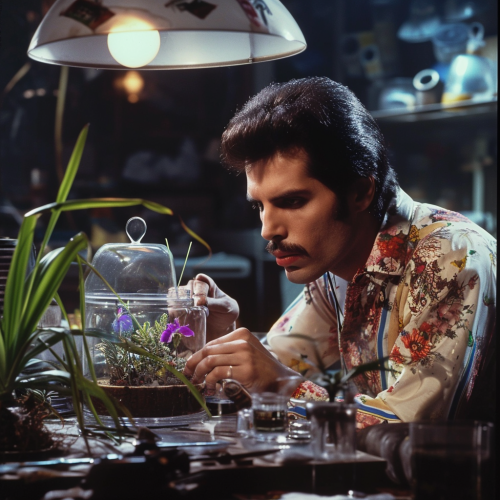 photo of Freddy Mercury making a terrarium. His expression shows he's concentrating hard. --v 6.0