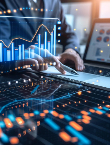 Growth arrows. Business development to success and growing growth concept, Hand pointing arrow graph corporate future growth plan-arrow, concept of growth, enrichment, new technology company, investment in the future, strong business plan, income growth table, engineers in the background on the production floor, scale of growth, modern machinery, business concept, super realistic --ar 16:9 --v 5.2 --s 750